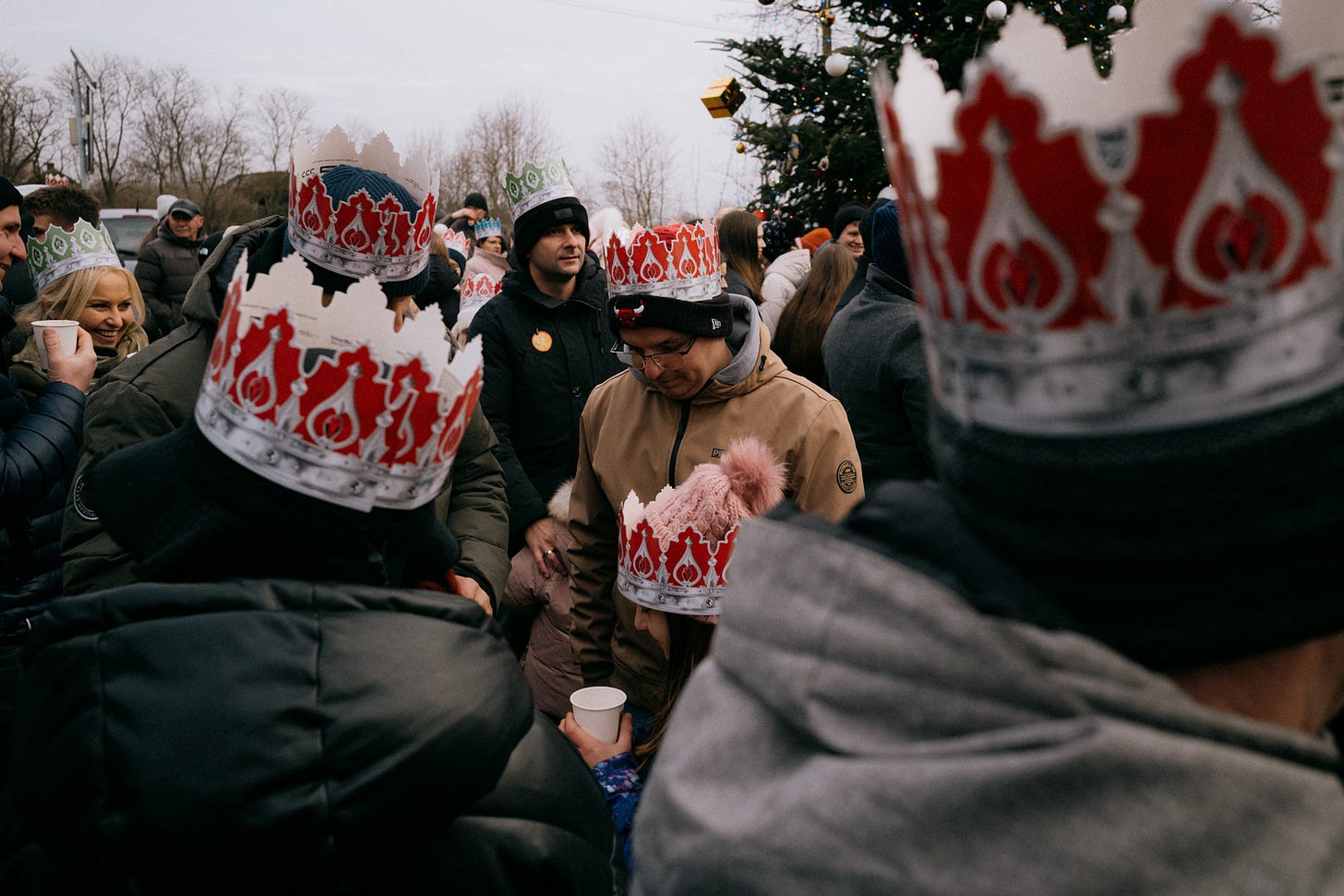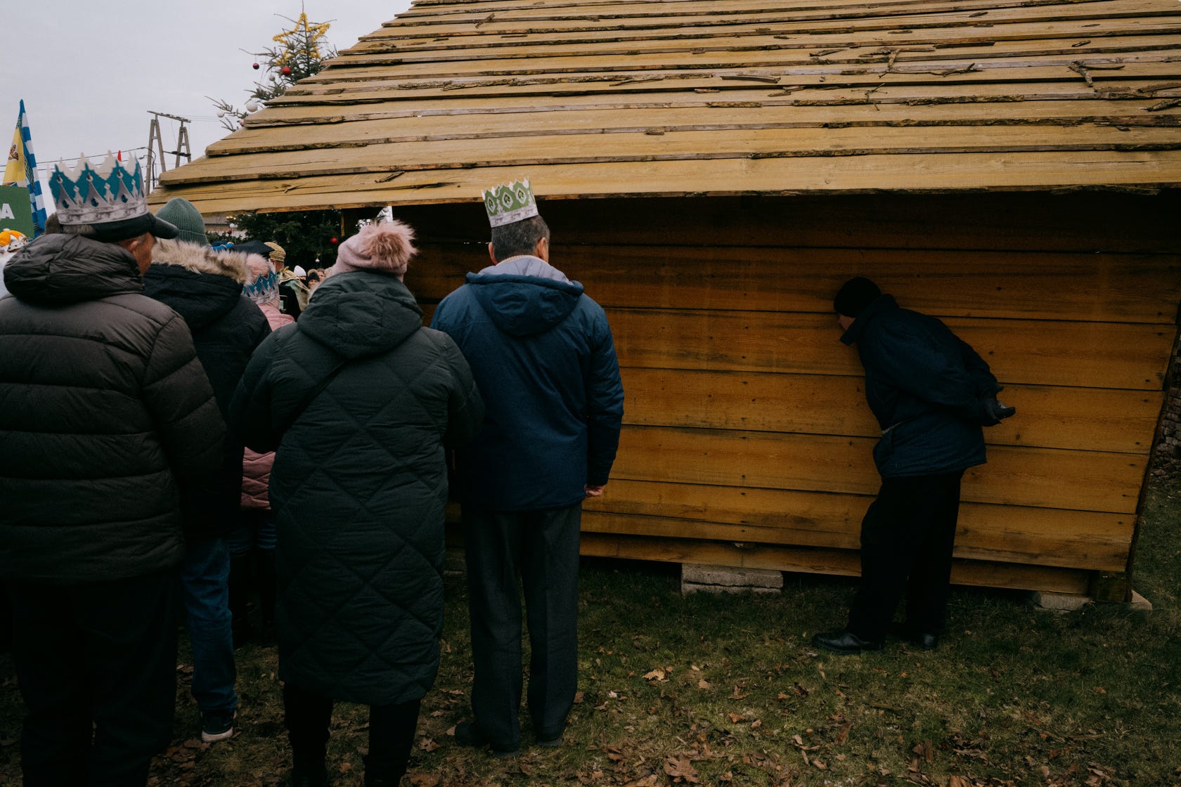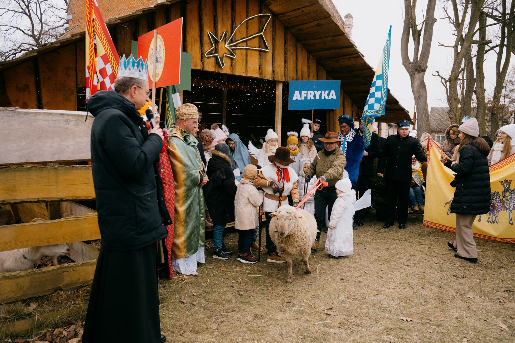 After the ceremony the procession with three kings exits the church and proceeds to greet baby Jesus. Kids are wearing angel and shepherd costumes, and majority of people are wearing paper crowns.