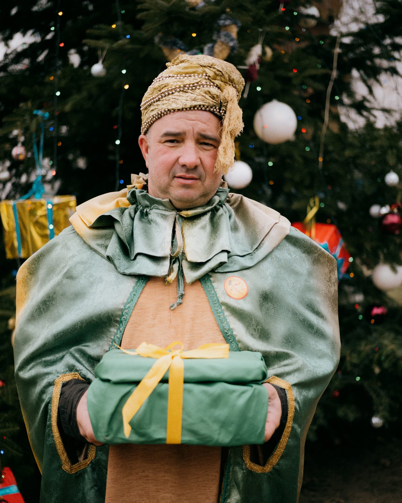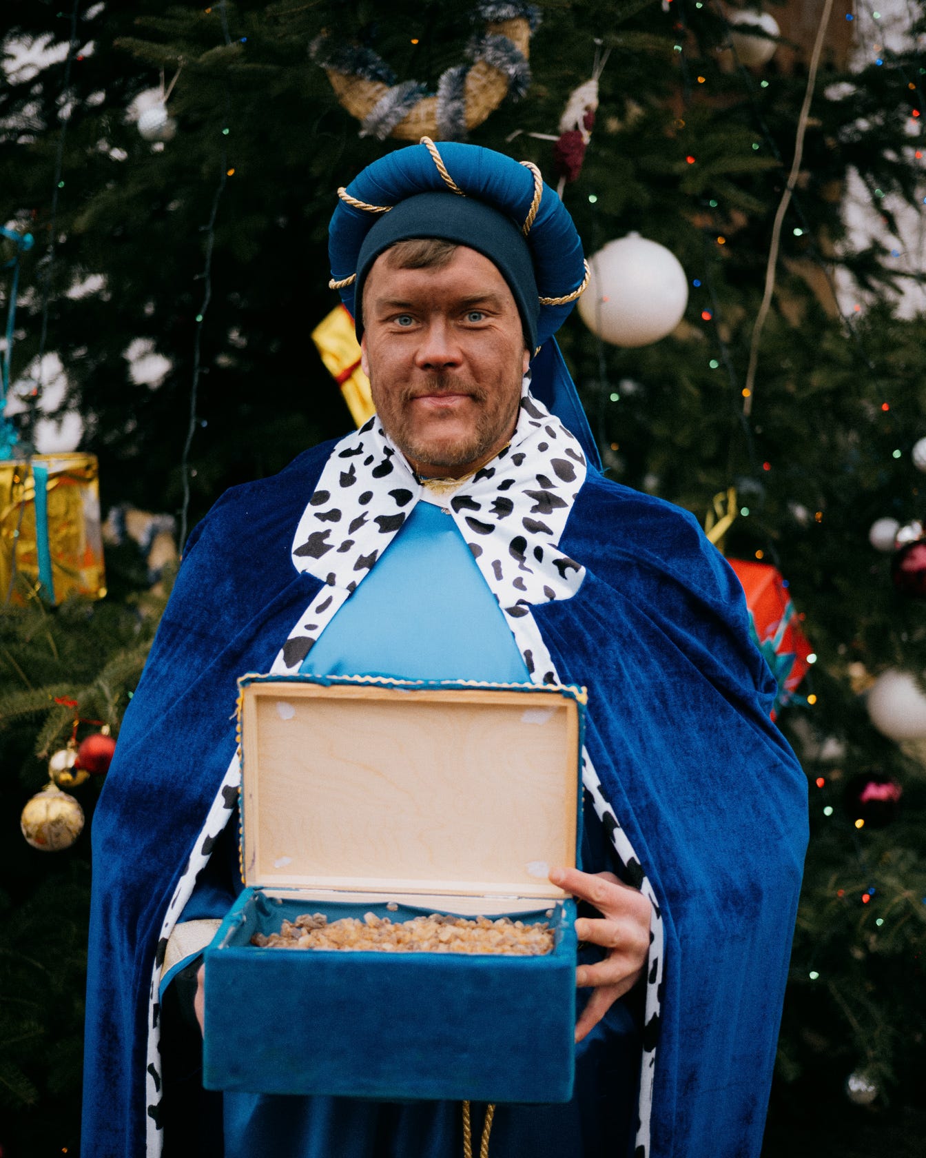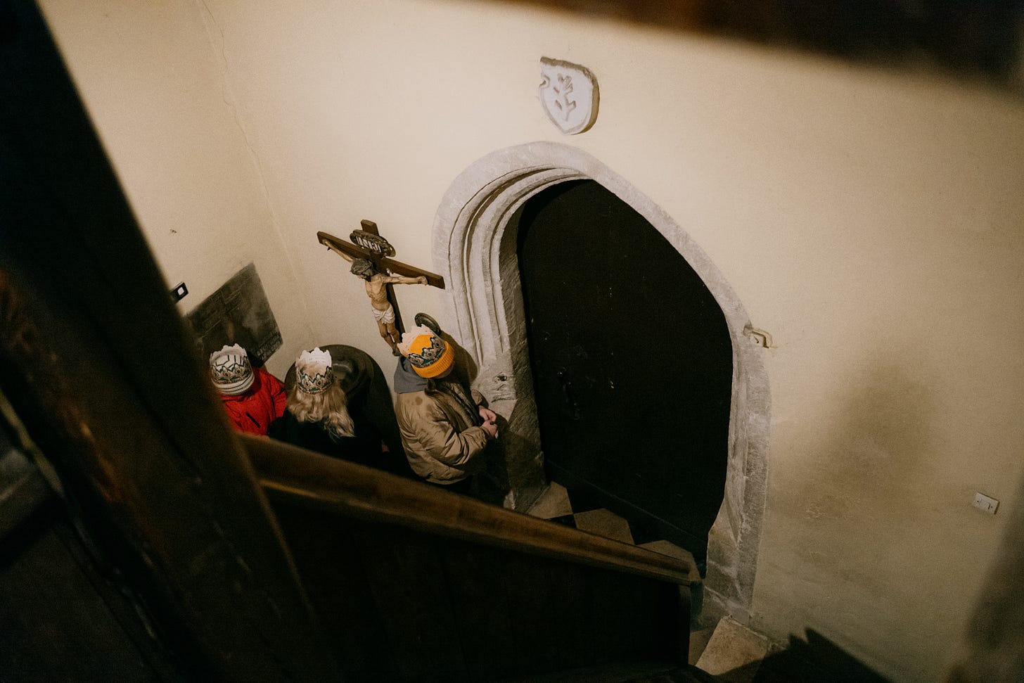 After the ceremony the procession with three kings exits the church and proceeds to greet baby Jesus. Kids are wearing angel and shepherd costumes, and majority of people are wearing paper crowns.